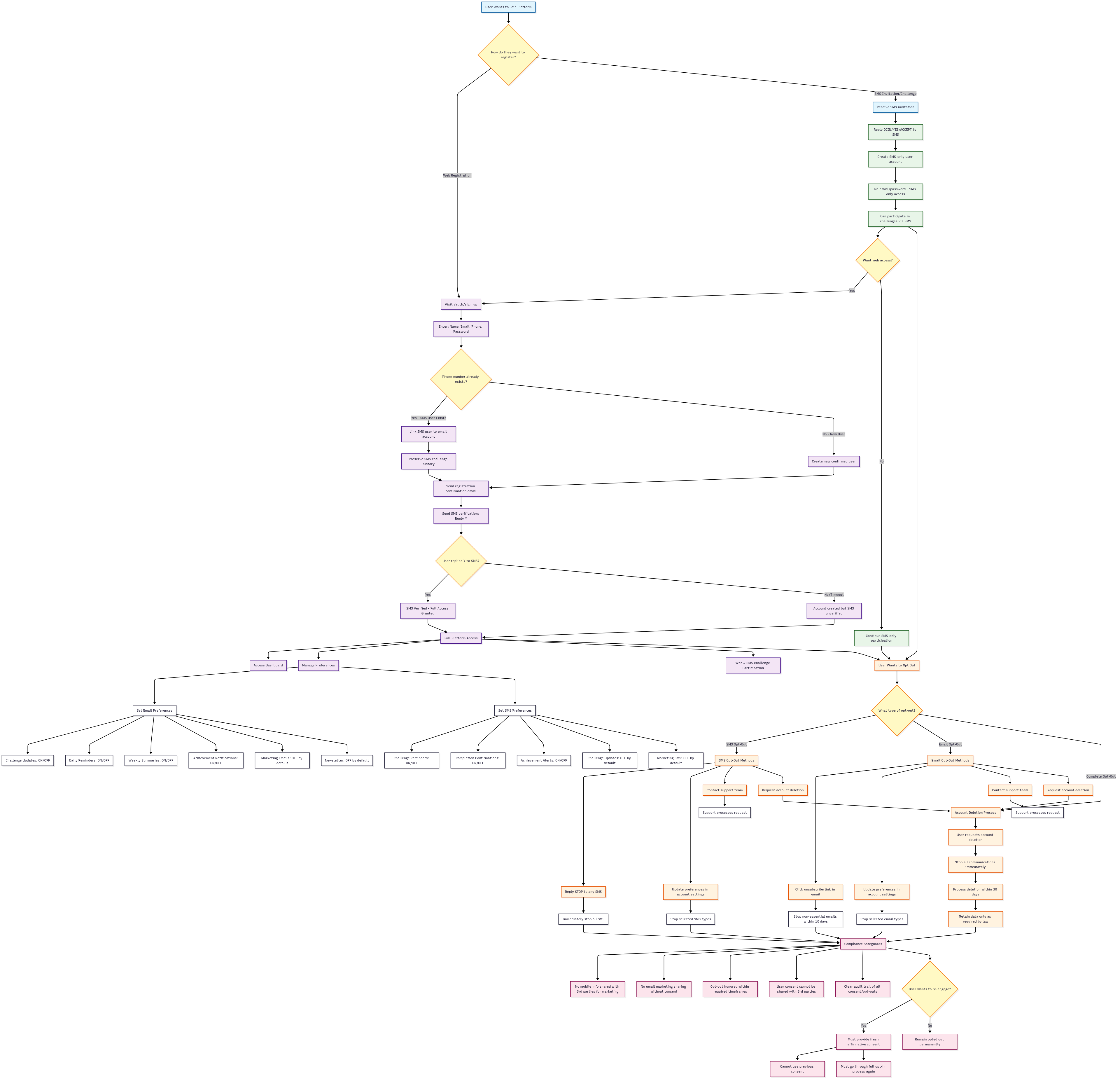 This diagram illustrates how users register for communications and all available methods to opt out of SMS and email messages.